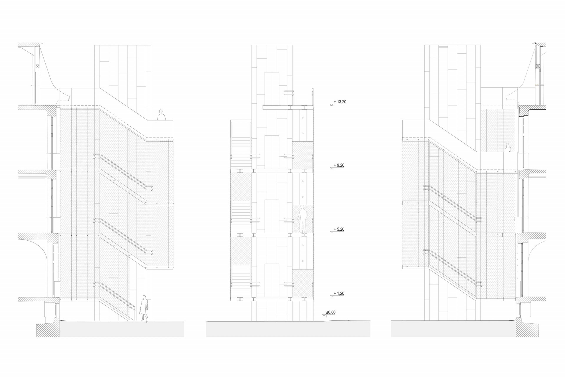 Am Ende eine Lösung mit einem Netz, anstatt mit geschlossenen Brüstungen. Somit wird trotz des Volumens des neuen Baukörpers vom Bestand möglichst wenig verdeckt.